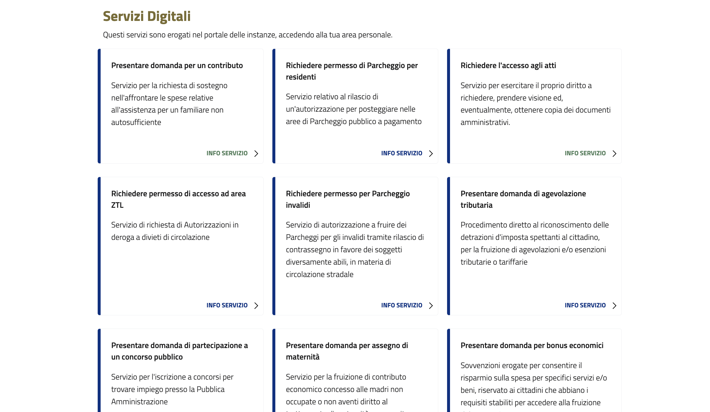 Servizi Digitali: l'elenco di tutti i servizi digitalizzati presenti nella sezione dei Servizi.
