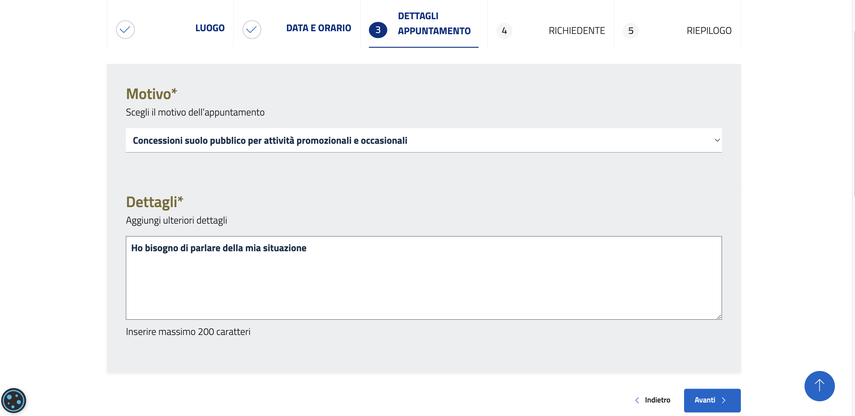 Selezionare uno dei motivi disponibili, completare la richiesta nel box Dettagli e cliccare Avanti.