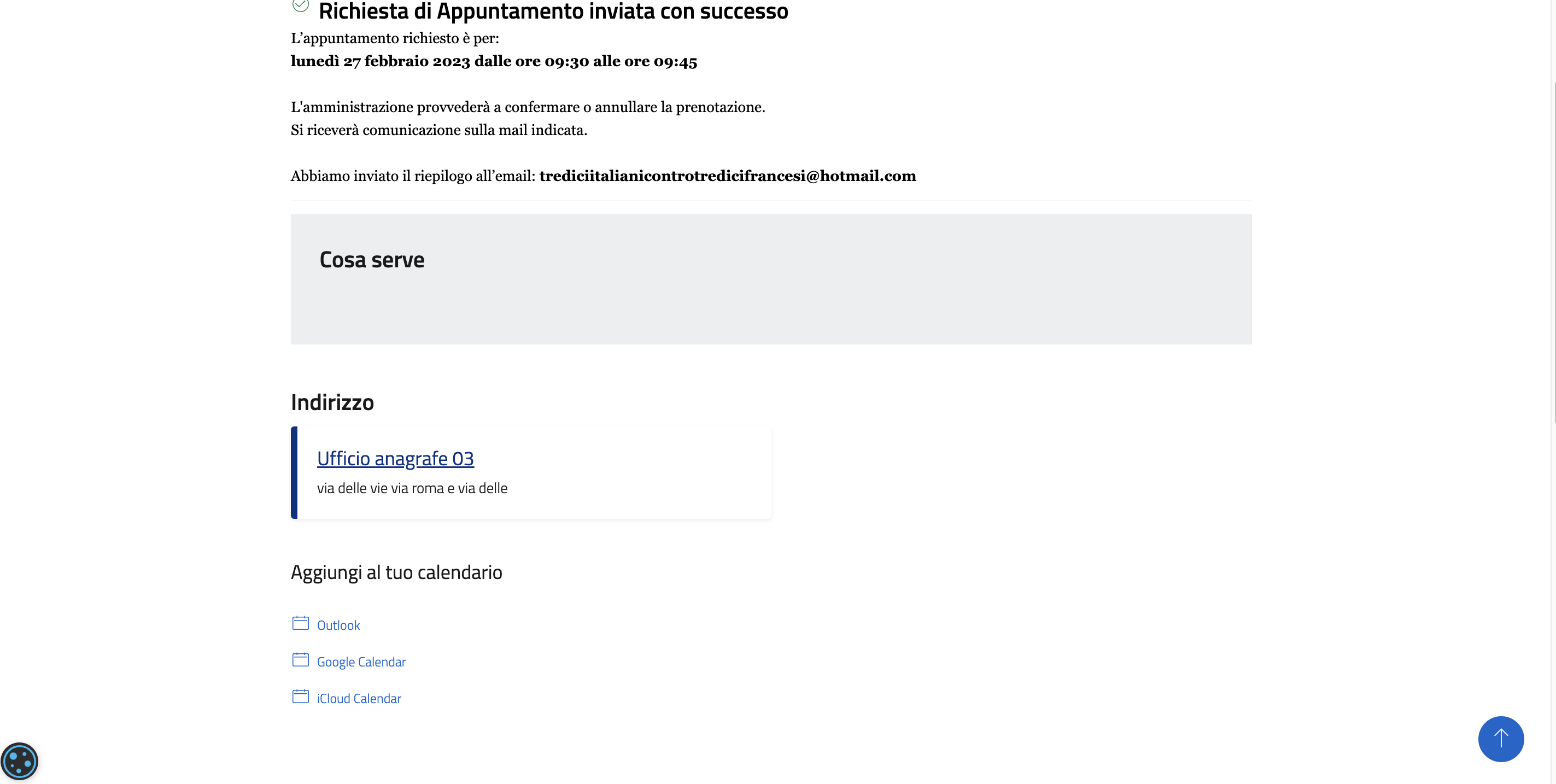 L'ultima pagina mostra l'effettivo invio della richiesta di appuntamento, che è possibile salvare anche all'interno del proprio calendario personale.