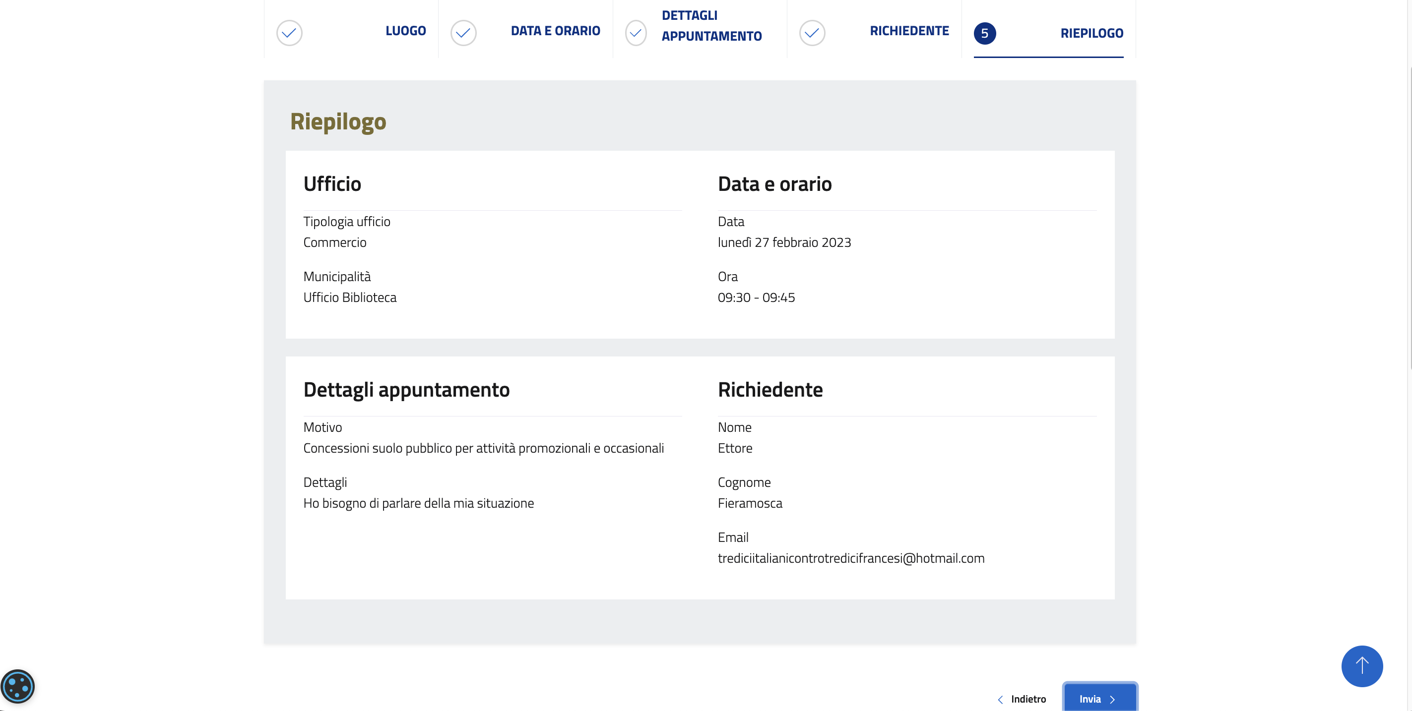 Controllare nel riepilogo che tutte le informazioni siano state inserite correttamente e cliccare Invia.