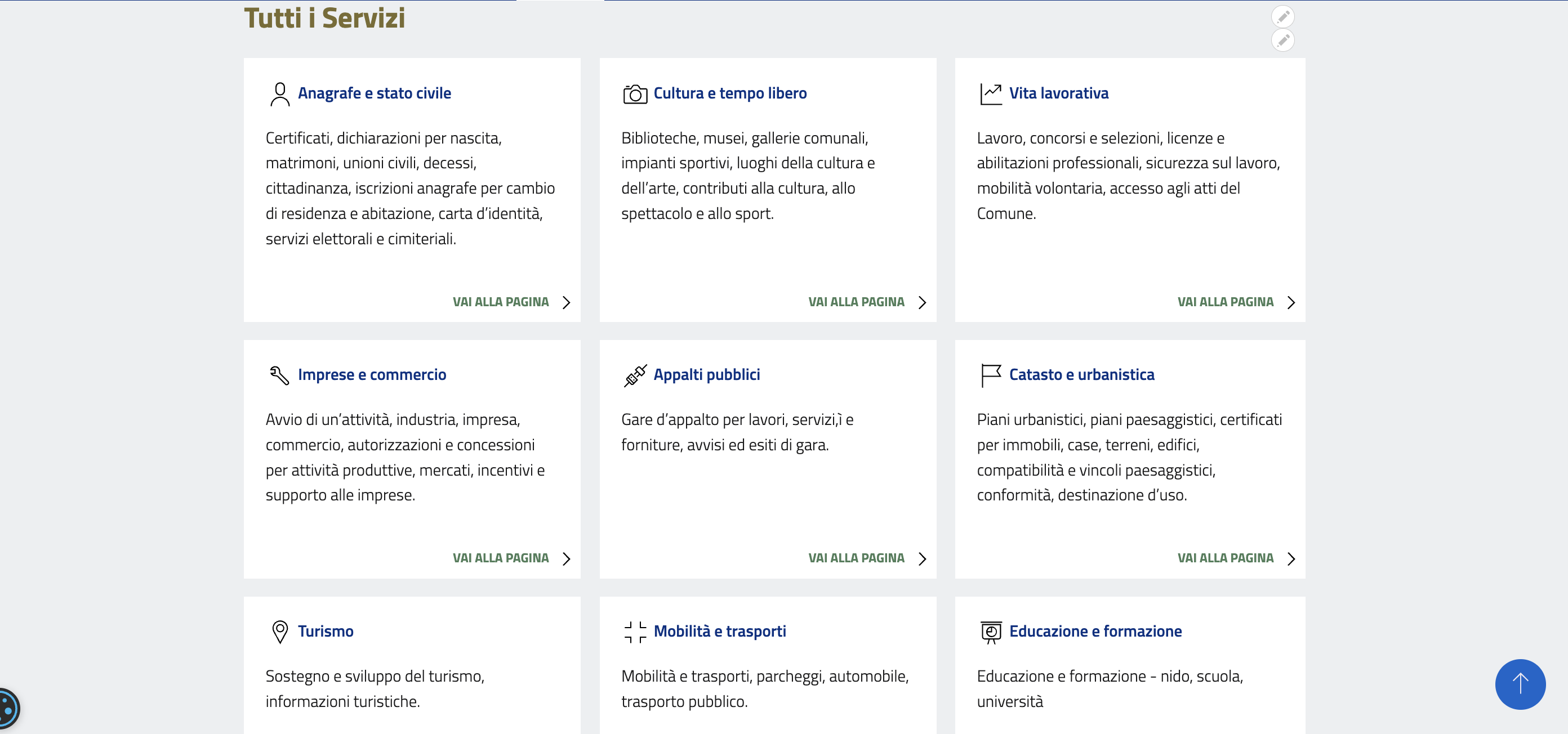 La pagina rappresenta un vero e proprio catalogo dei Servizi, siano essi totalmente digitalizzati, e quindi fruibili comodamente dal proprio dispositivo, oppure "fisici", quindi accessibili fisicamente presso gli uffici preposti.